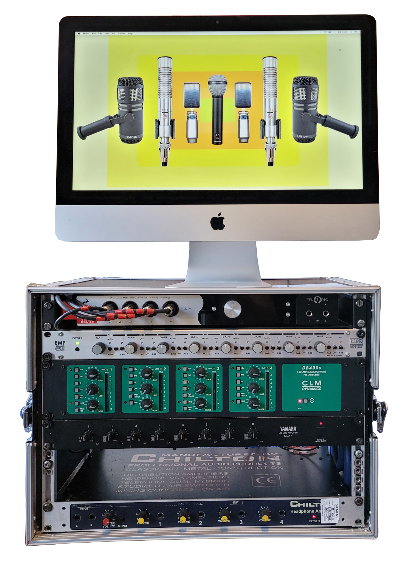 We used hypercardioide microphones to isolate the guitars and bass from the other sound sources and ran them into some tasty analog mic preamps. In the box below we have the gorgeous Line Audio 8mp pre’s and the high end CLM pre’s for clarity, plus the Yamaha MLA7’s for colour. We leave some rack space empty so we can bring different preamps to each session – we have everything from vintage tube preamps to super clear modern solid state pre’s – and just about everything inbetween such as JJ’s API 512’s to Phoenix Audio Neve clones.